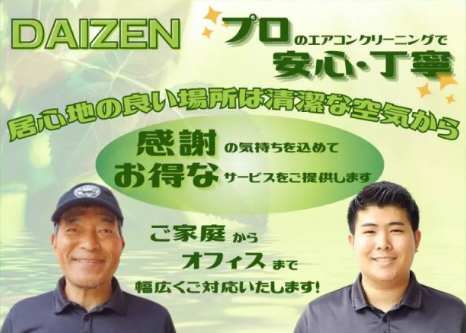先日急に暑くなったので冷房を付けたところ、すごくカビ臭がしたので(6年前購入一度も掃除なし)急遽お掃除業者をネットで探したところDAIZENさんがお安くて口コミもとても良かったのでお願いしました。ただ初めての依頼だったのでドキドキしましたが、当日までのメールのやり取りもとても親切でした。当日は永石さんが担当してくださいました。初めてお会いしましたがとても話しやすく安心感のある方で、もちろんお仕事もテキパキと動かれてエアコンがすごく綺麗になってよみがえりました!臭いも消えました!今後のエアコンの取り扱いなども教えていただき本当に丁寧なお仕事ぶりで感謝でいっぱいです。また次回もお願いしたいですし、お友達にも是非紹介したいと思います。この度は本当にありがとうございました。
